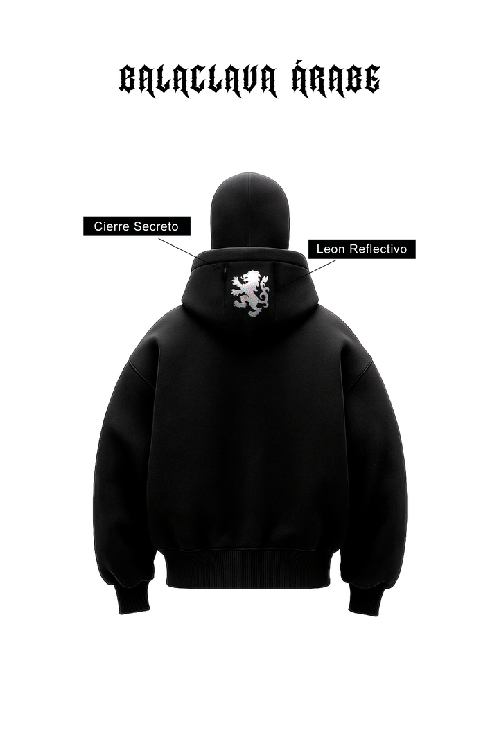 Polera de 100% algodón franela, cuenta con una balaclava completa incorporada y un cierre secreto en la capucha, estampados en alto relieve '3D' y reflectivo.