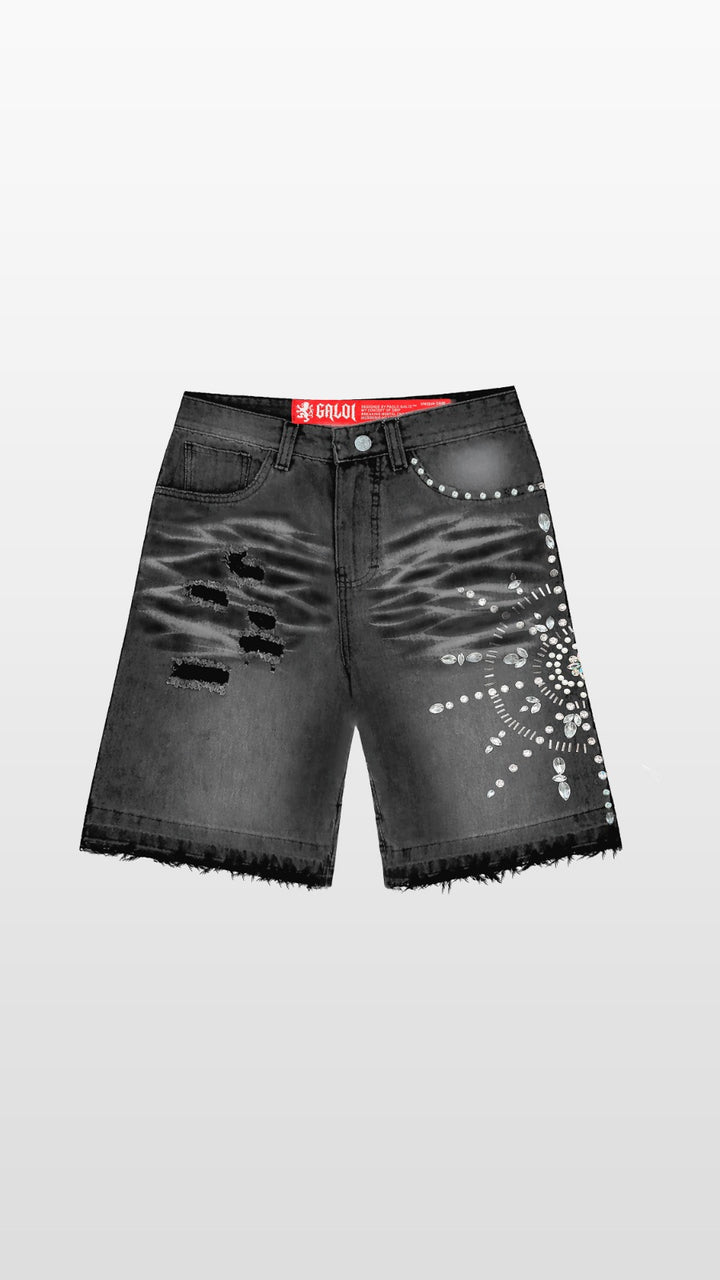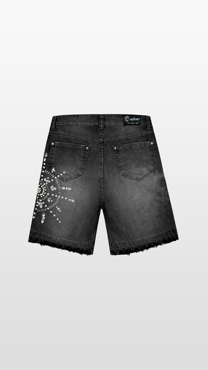 Short jean de nuestra línea UNIQUE DRIP, con diferentes tipos de pedrería cocidas a mano 1x1, rasgados y focalizados flama marca de la casa que hacen de esta una pieza única en Perú.